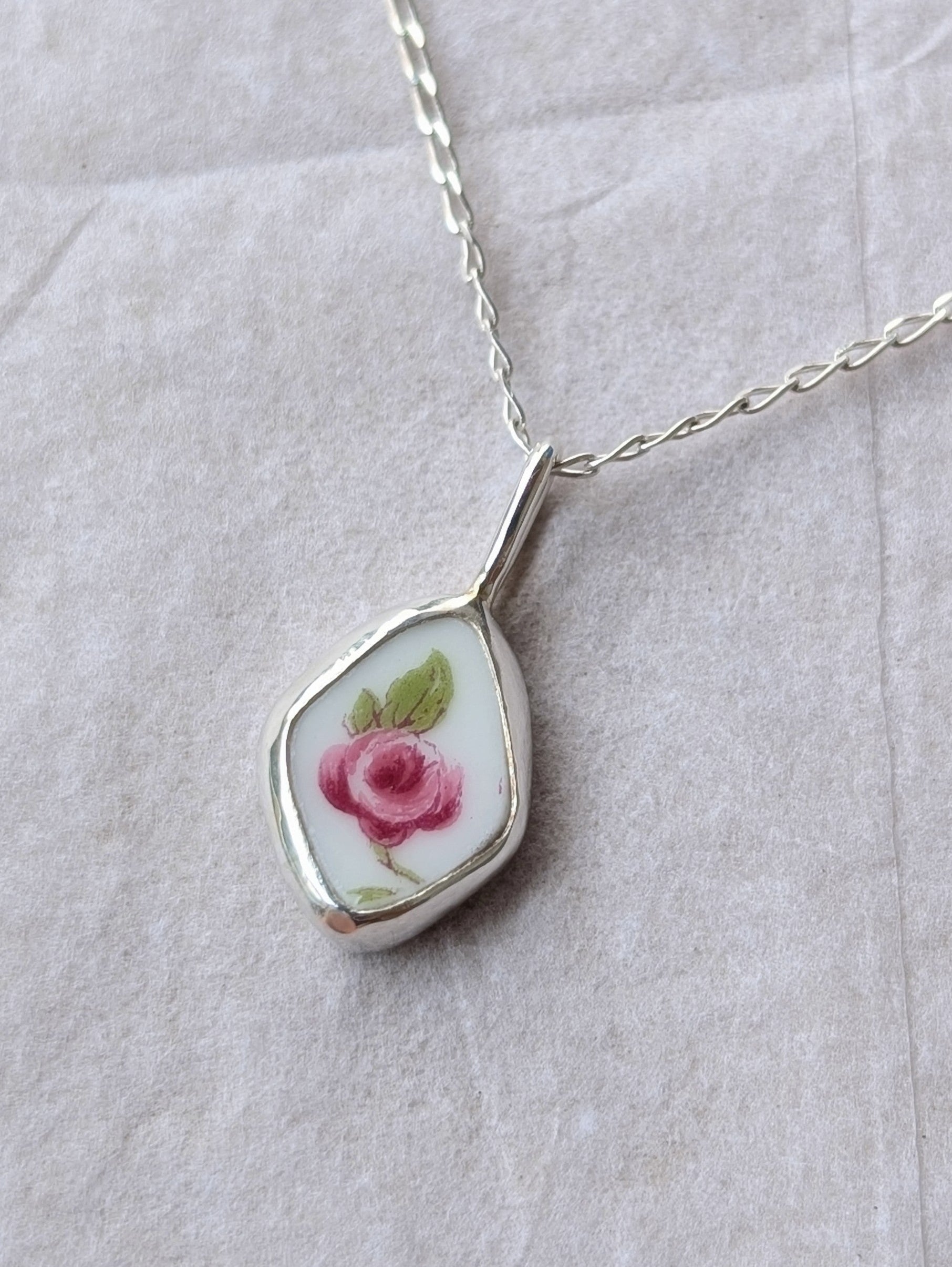 Ce collier est créé à partir d’un fragment de porcelaine ancienne de seconde main, soigneusement découpé puis façonné à la main avant d’être serti dans un délicat pendentif alliant argent fin et argent sterling 925. Le pendentif est conçu avec un dos ouvert qui n'est pas visible une fois porté.