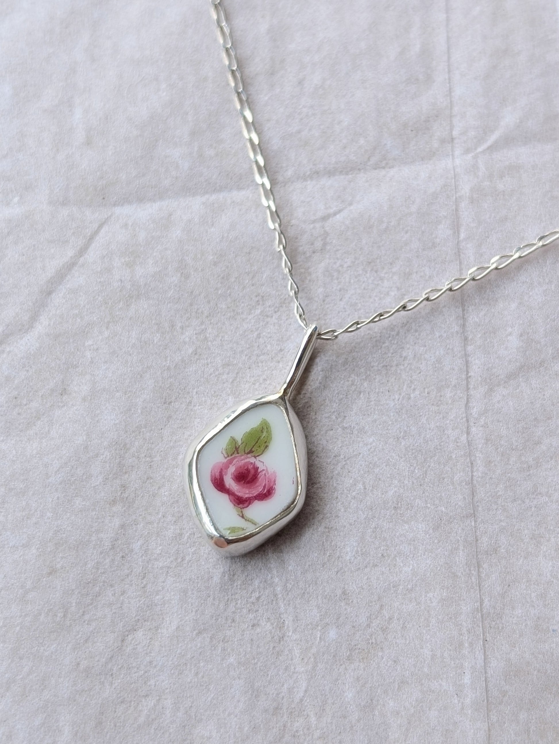 Ce collier est créé à partir d’un fragment de porcelaine ancienne de seconde main, soigneusement découpé puis façonné à la main avant d’être serti dans un délicat pendentif alliant argent fin et argent sterling 925. Le pendentif est conçu avec un dos ouvert qui n'est pas visible une fois porté.