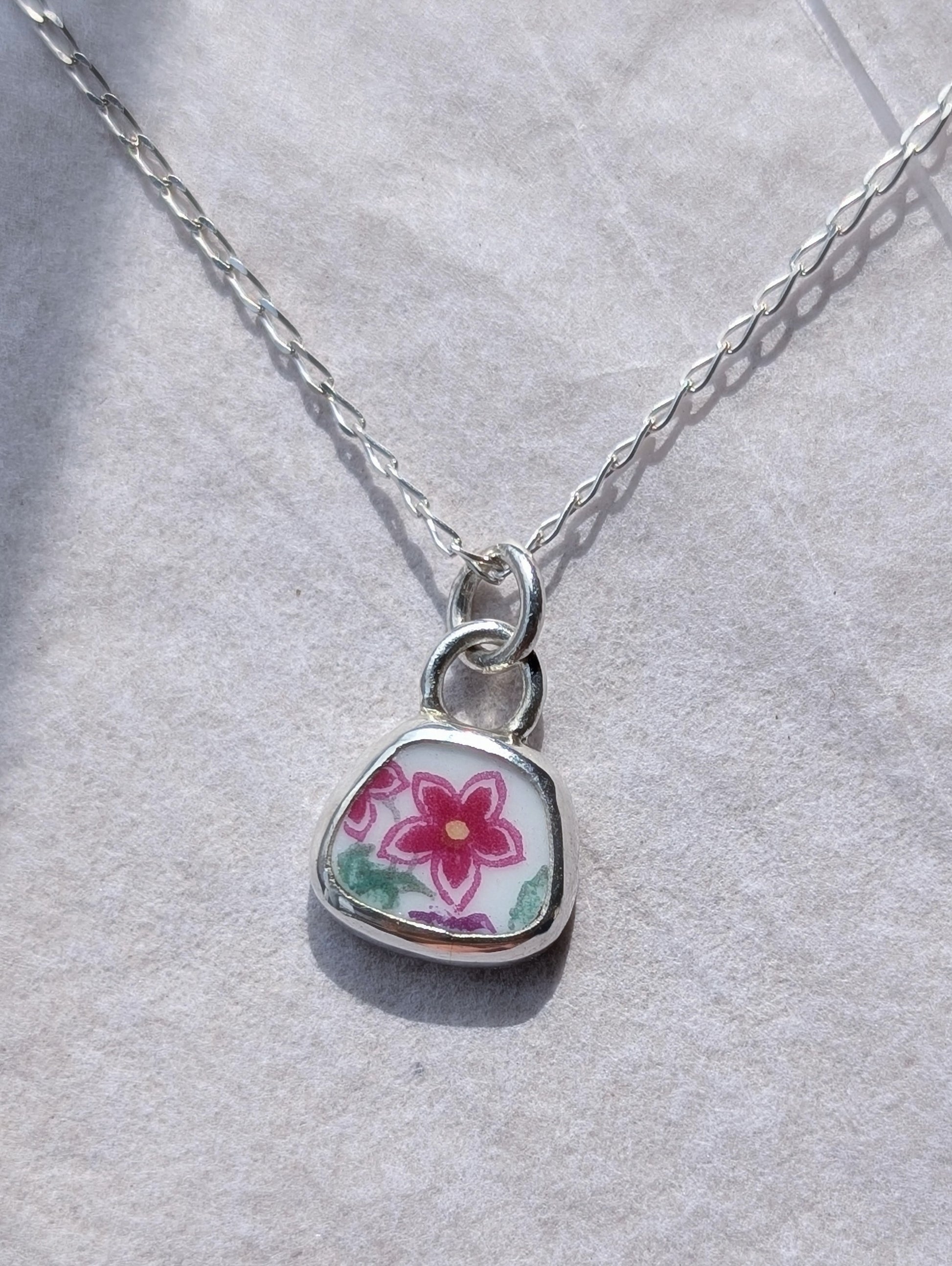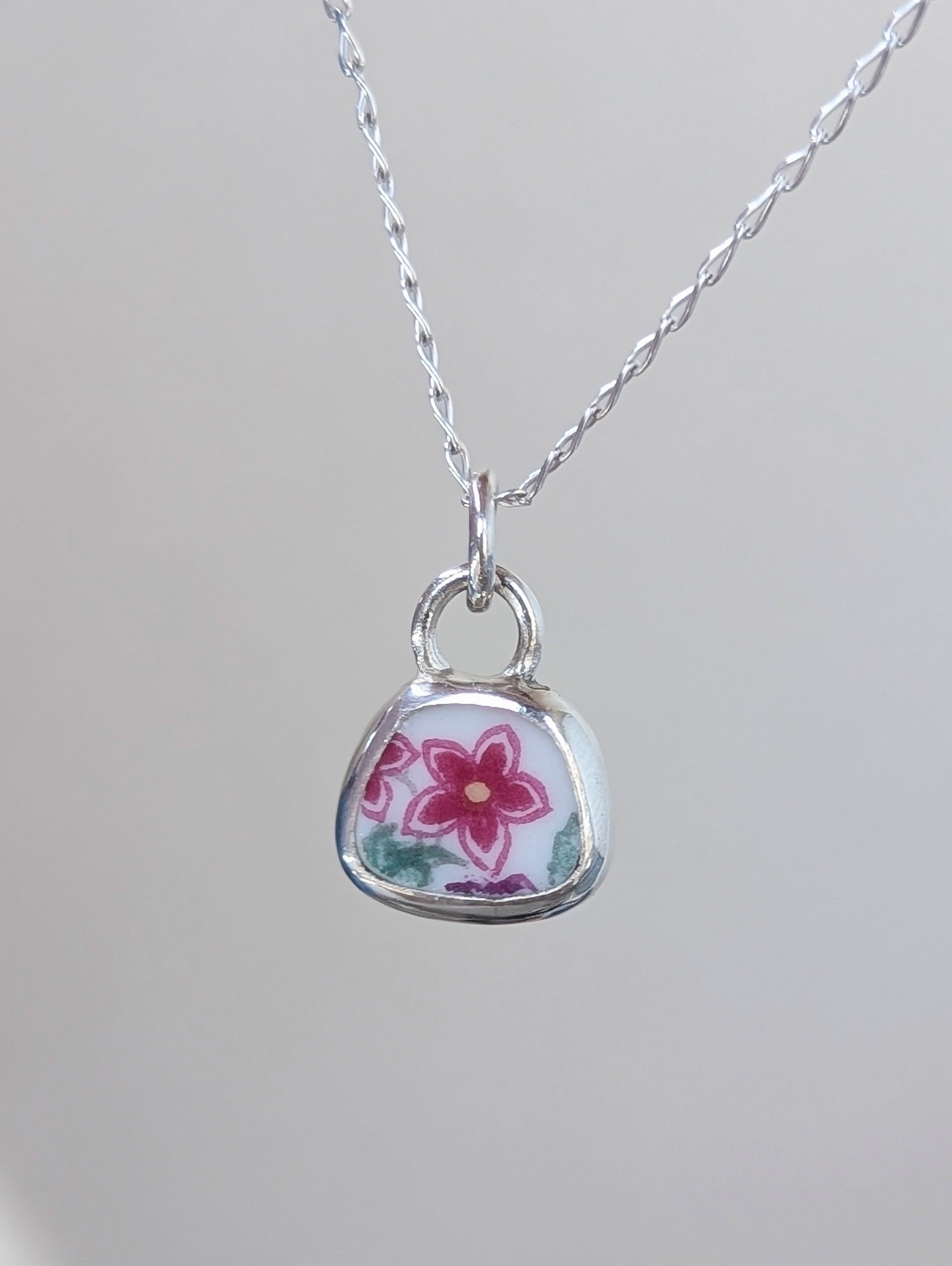 Ce collier est créé à partir d’un fragment de porcelaine ancienne de seconde main, soigneusement découpé puis façonné à la main avant d’être serti dans un délicat pendentif alliant argent fin et argent sterling 925. Le pendentif est conçu avec un dos ouvert qui n'est pas visible une fois porté.